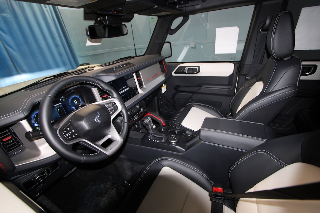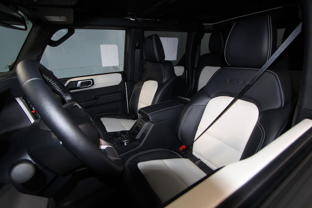 18" Bright Machined Aluminum Wheels, 360-Degree Camera, 4-Wheel Disc Brakes, 60th Anniversary Package, 7 Speakers, ABS brakes, Adaptive Cruise Control, Air Conditioning, Alloy wheels, AM/FM radio: SiriusXM with 360L, AM/FM Stereo, Auto High-beam Headlights, Auto-dimming Rear-View mirror, Automatic temperature control, Black Molded-in-Color Door Handles, Brake assist, Compass, Connected Navigation, Delay-off headlights, Driver door bin, Driver vanity mirror, Dual front impact airbags, Dual front side impact airbags, Electronic Stability Control, Emergency communication system: 911 Assist, Equipment Group 314A Lux Package, Evasive Steering Assist, Exterior Parking Camera Rear, Ford Connectivity Package (1-Year Included), Front anti-roll bar, Front Bucket Seats, Front Center Armrest, Front dual zone A/C, Front fog lights, Front Parking Sensors, Front reading lights, Front wheel independent suspension, Fully automatic headlights, Hard Top Sound Deadening Headliner, Heated door mirrors, Heated front seats, Heated Leather-Trimmed/Vinyl Bucket Seats, Heated steering wheel, High Clearance Fender Flares, High Clearance Suspension, Illuminated entry, Information on Demand Panel, Integrated roll-over protection, Leather Shift Knob, Leather-Trimmed/Vinyl Bucket Seats, Low tire pressure warning, Navigation system: Connected Navigation, Occupant sensing airbag, Outside temperature display, Overhead airbag, Overhead console, Painted Door Handles, Panic alarm, Passenger door bin, Passenger vanity mirror, Position-Sensitive Bilstein Shock Absorbers, Power door mirrors, Power driver seat, Power passenger seat, Power steering, Power windows, Radio data system, Rear seat center armrest, Remote keyless entry, Sasquatch Package, Security system, Sideview Mirrors, SiriusXM with 360L, Speed control, Split folding rear seat, Steel Front Bumper, Steering wheel mounted audio controls, SYNC 4, Tachometer, Telescoping steering wheel, Tilt steering wheel, Traction control, Trip computer, Variably intermittent wipers, Voltmeter, Warm Alloy Grille, Wheels: 17" Gravity Gray-Painted Alloy, Wheels: 17" Matte Black Alloy, Wimbledon White-Painted Hard Top.